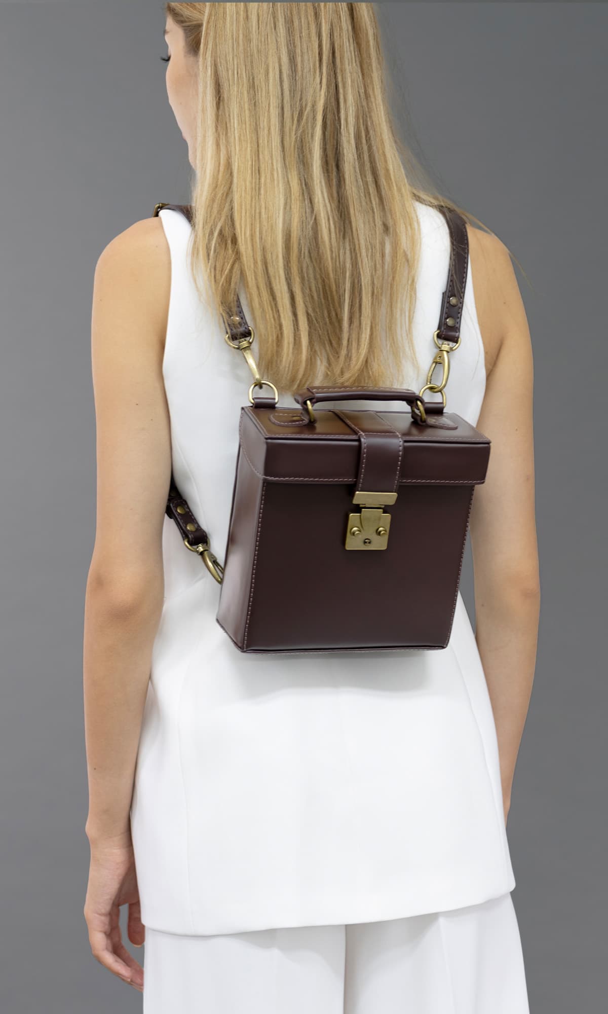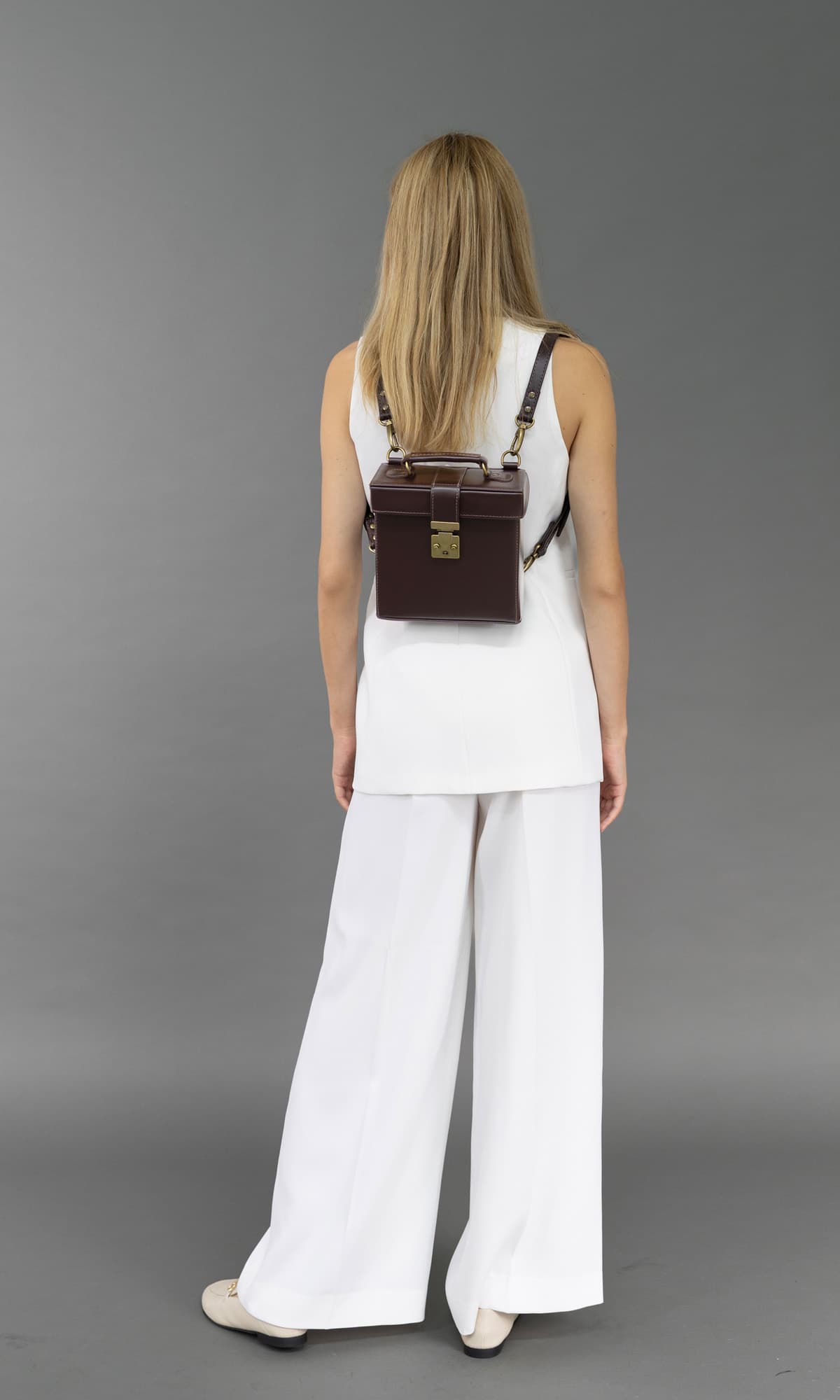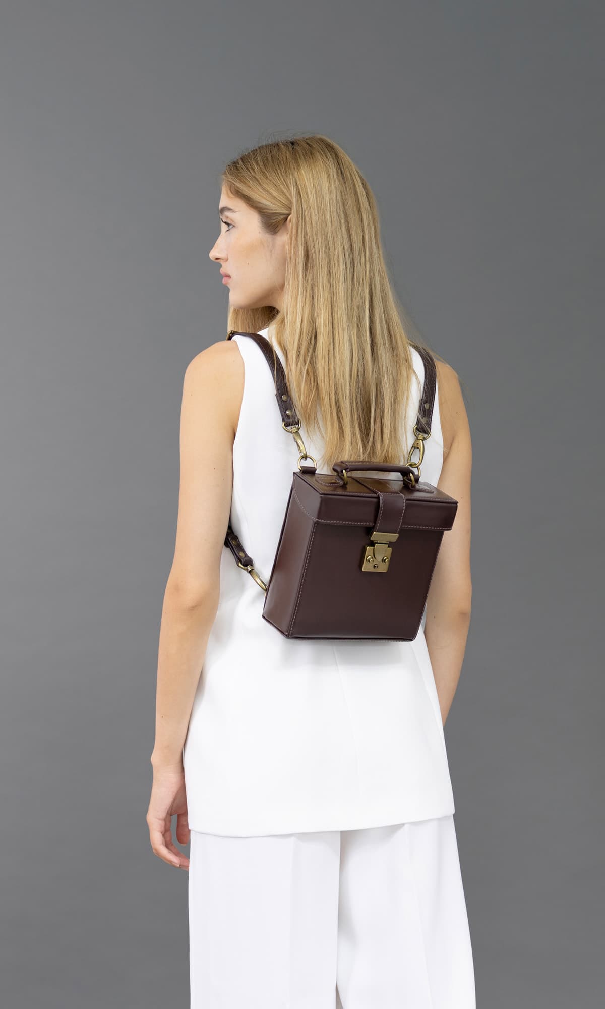 The Lila is a versatile accessory that can be styled as an adorable box backpack or worn across the body as a chic handbag. Crafted entirely from structured leather, it features a clean, minimalist interior and a sleek exterior silhouette.