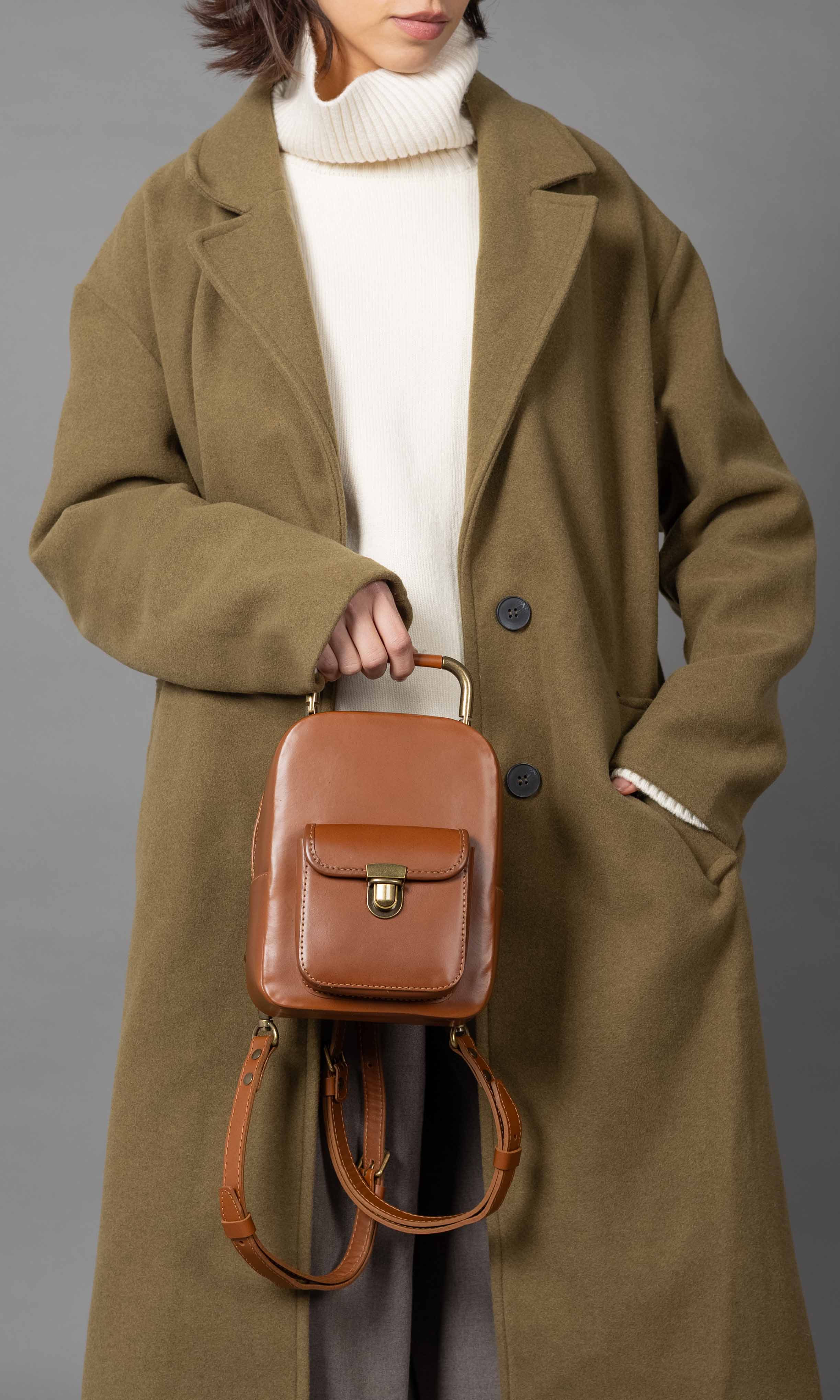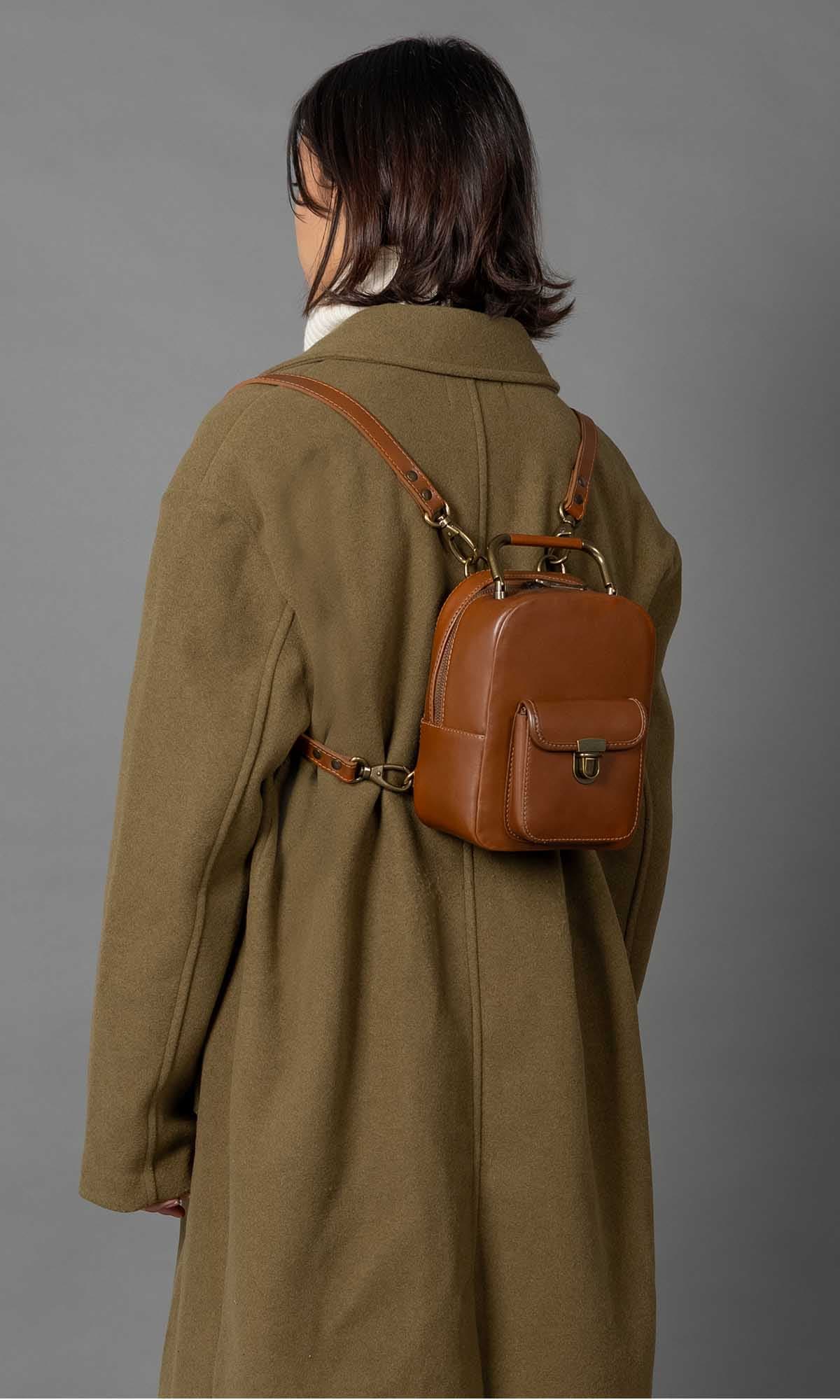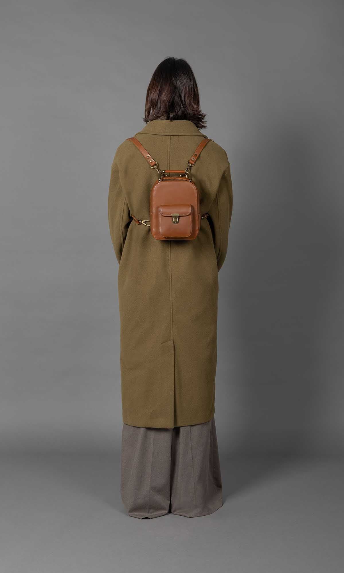 The adorable Yoyo backpack/handbag is skillfully crafted from smooth and soft natural caramel leather. Its simple yet elegant design is accentuated by a strong brass zip, providing easy access to the main compartment. Adding a touch of timeless charm, an antique brass top handle graces the top. Versatility is the name of the game with Yoyo, as it can be carried by the top handle, worn straight from the shoulder with adjustable padded straps, or as a crossbody bag. The perfect companion for everyday adventures, this small backpack/handbag offers both style and functionality. Inside, you’ll find a soft cotton inner lining that treats your accessories with care.
