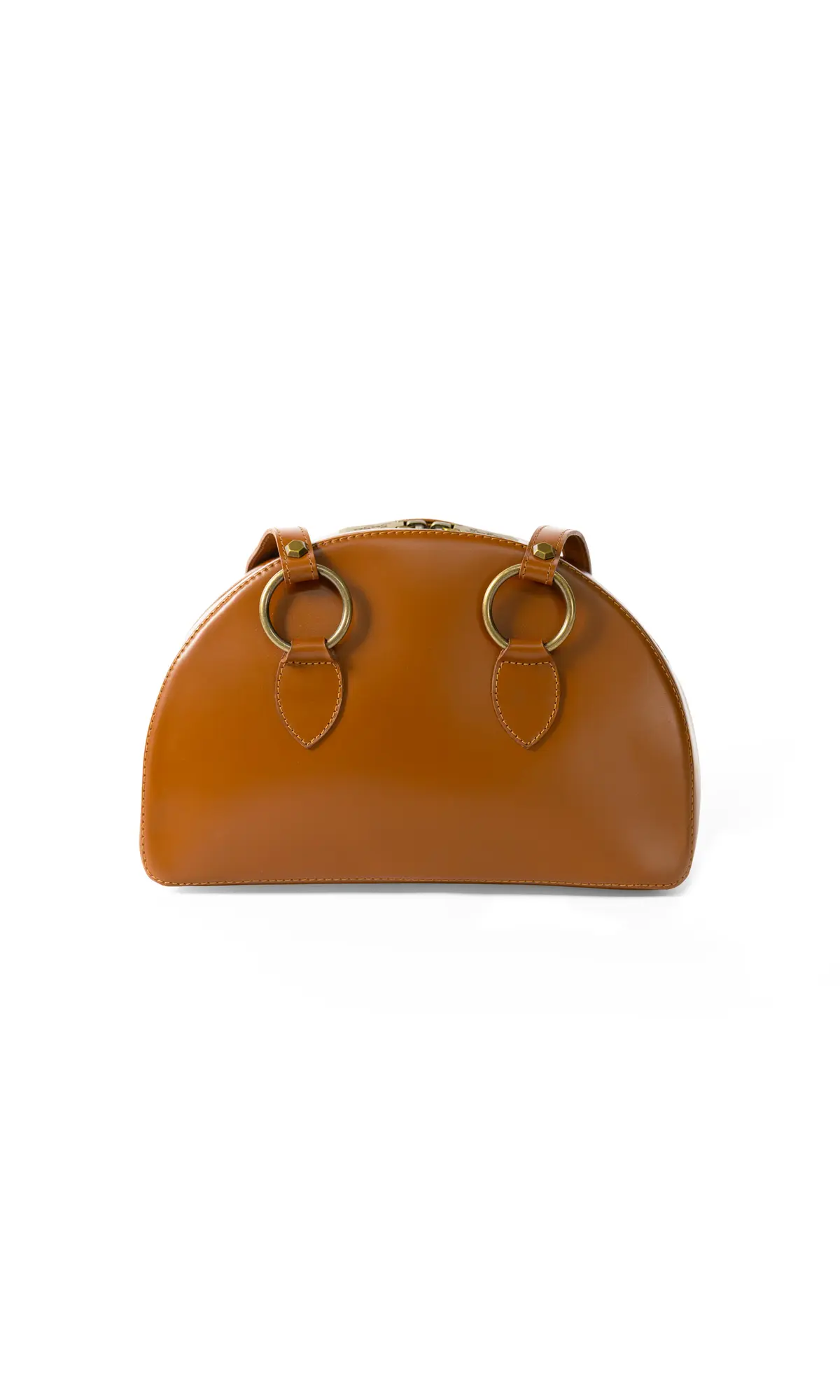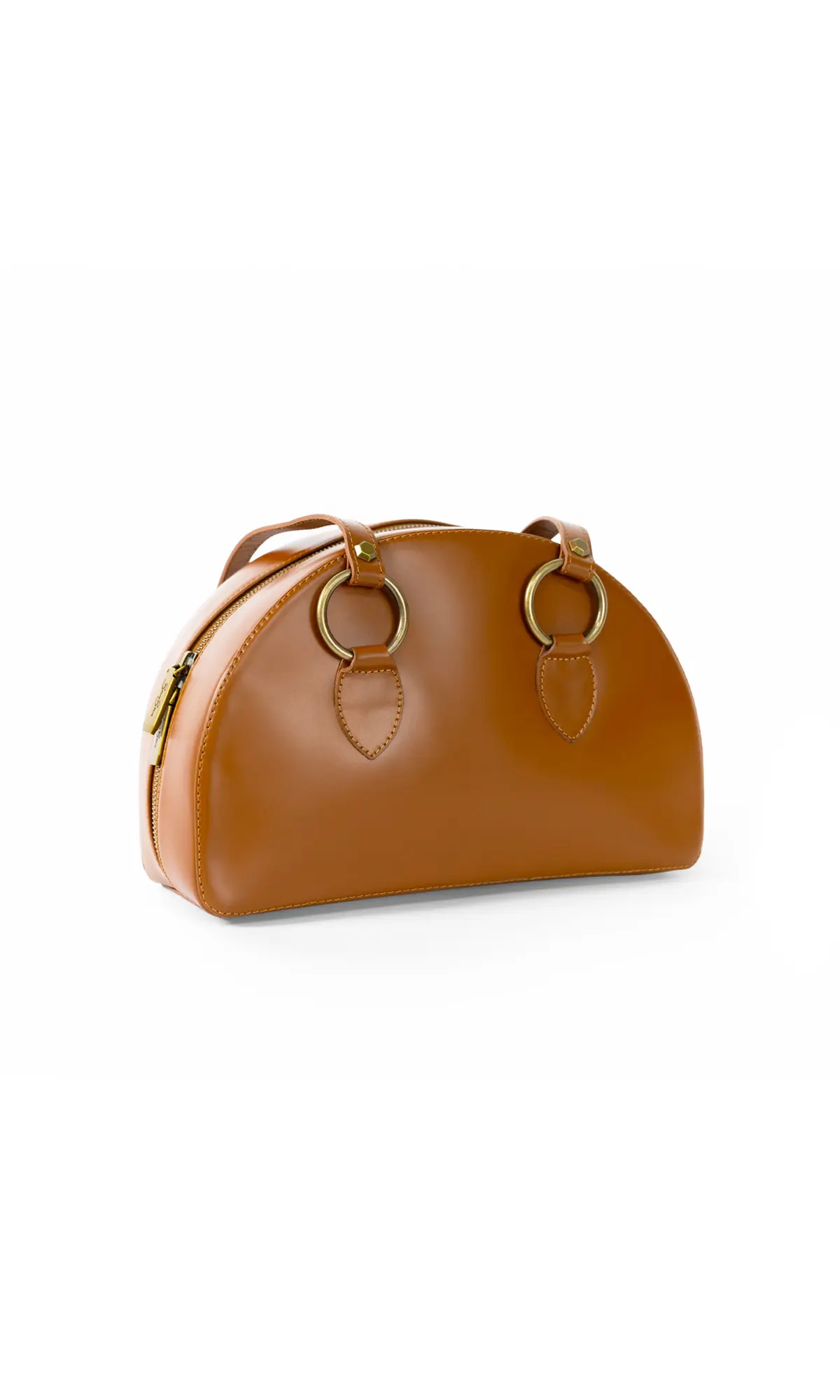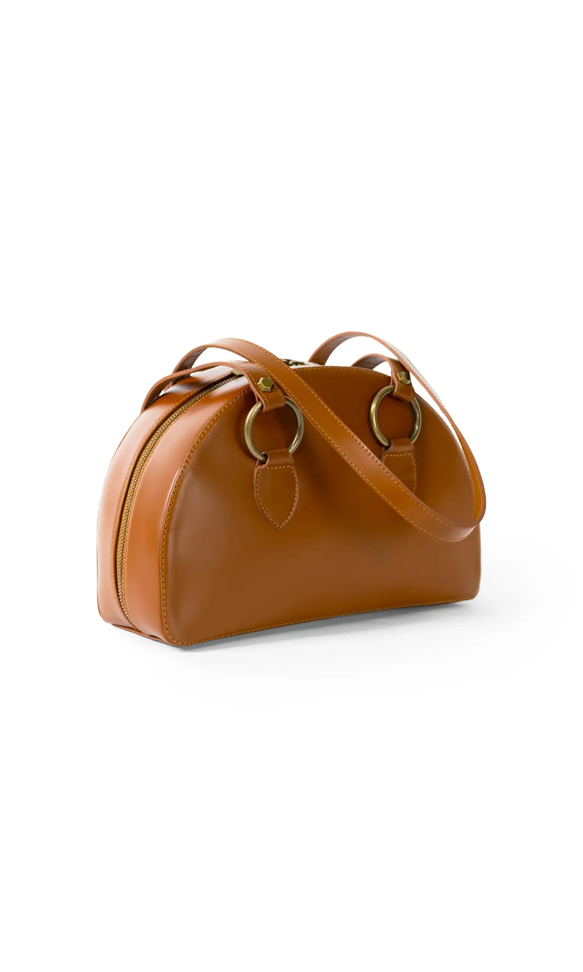 Handcrafted from thick, deep caramel leather, its surface is soft and supple, yet rugged enough to age beautifully. The silhouette echoes classic bowling bags: rounded, structured, and unmistakably retro. Brass rings anchor the handles, offering a touch of warm antiquity, while the shape and dual straps let the bag nestle snugly under your arm for comfort and ease.
