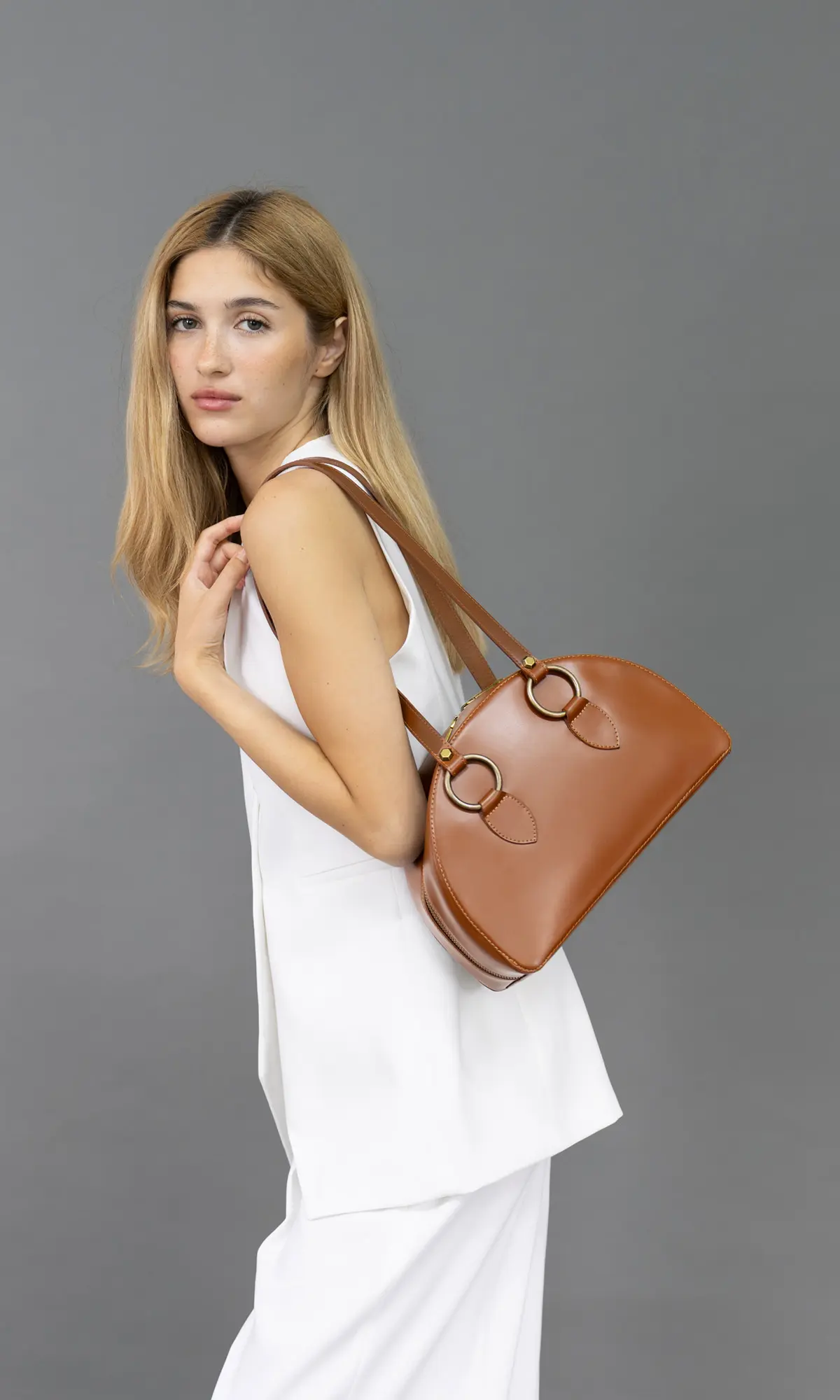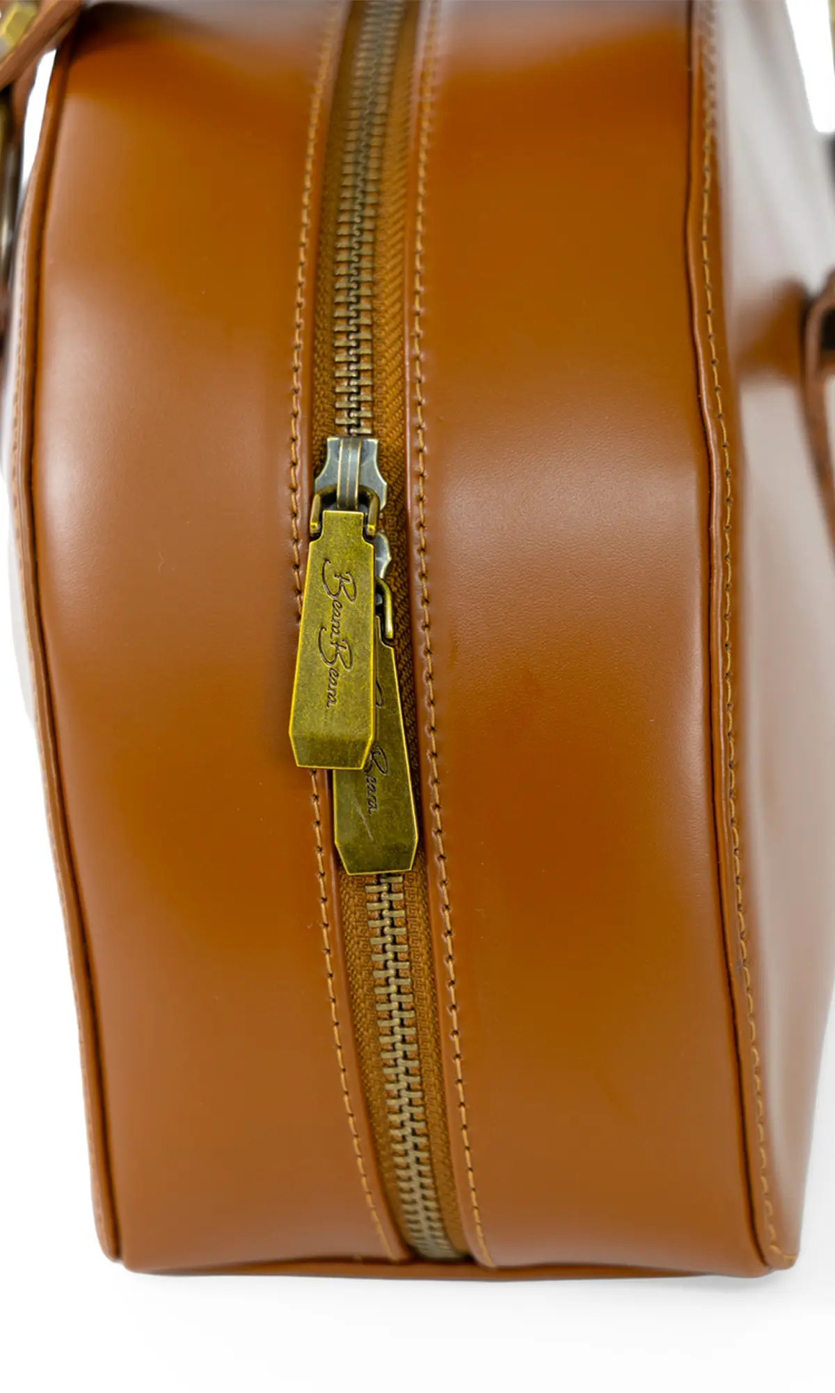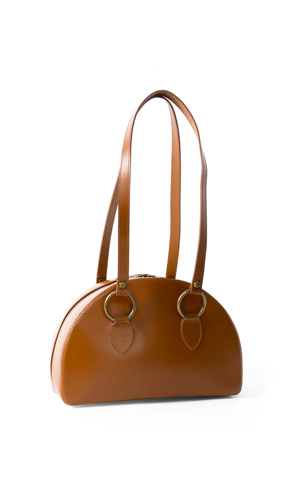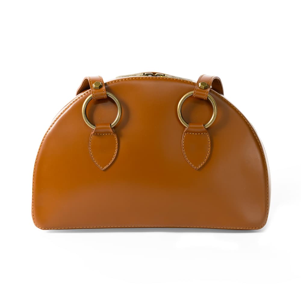 Handcrafted from thick, deep caramel leather, its surface is soft and supple, yet rugged enough to age beautifully. The silhouette echoes classic bowling bags: rounded, structured, and unmistakably retro. Brass rings anchor the handles, offering a touch of warm antiquity, while the shape and dual straps let the bag nestle snugly under your arm for comfort and ease.