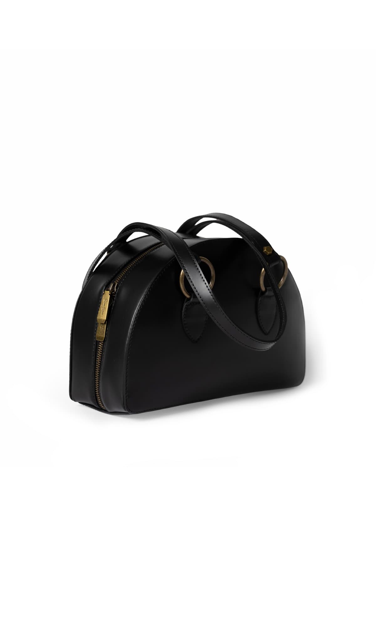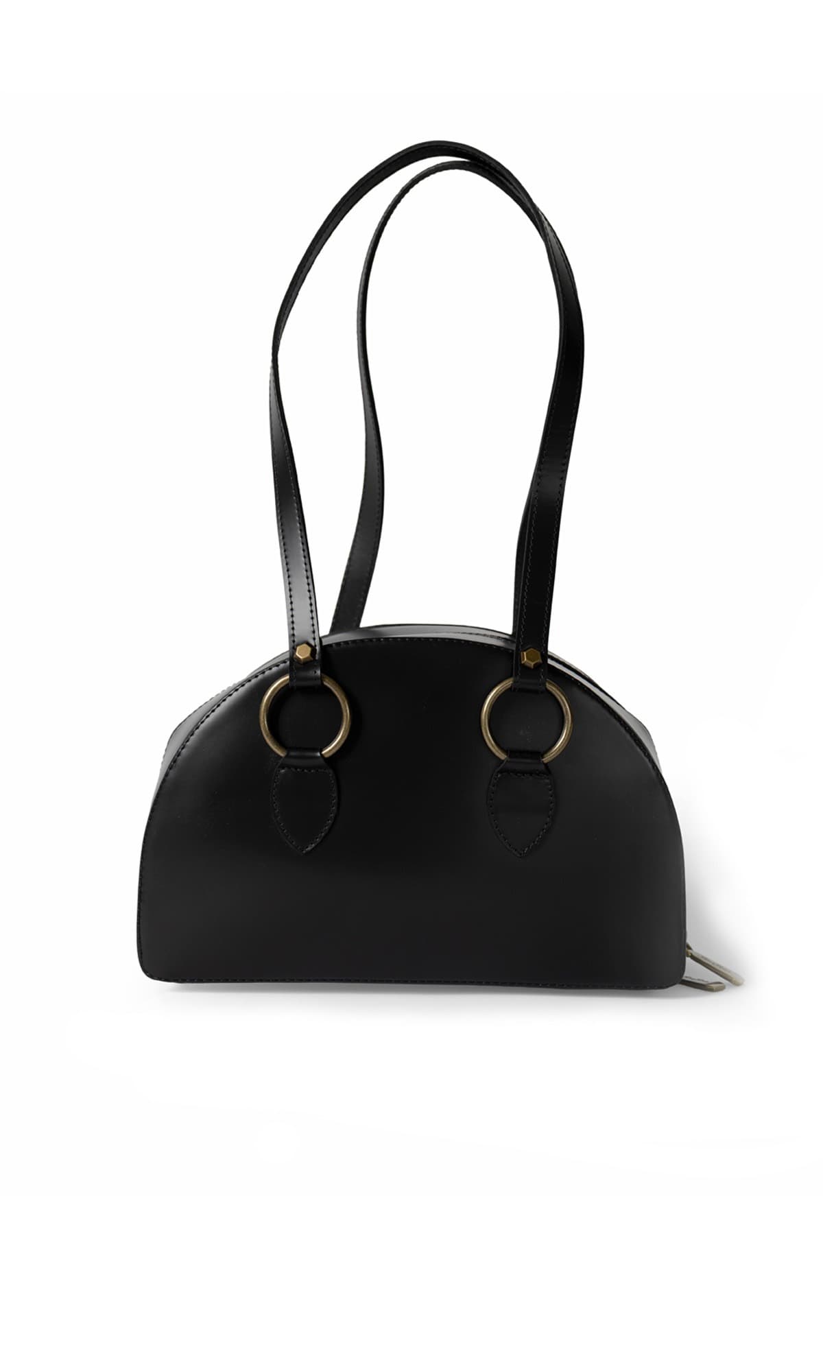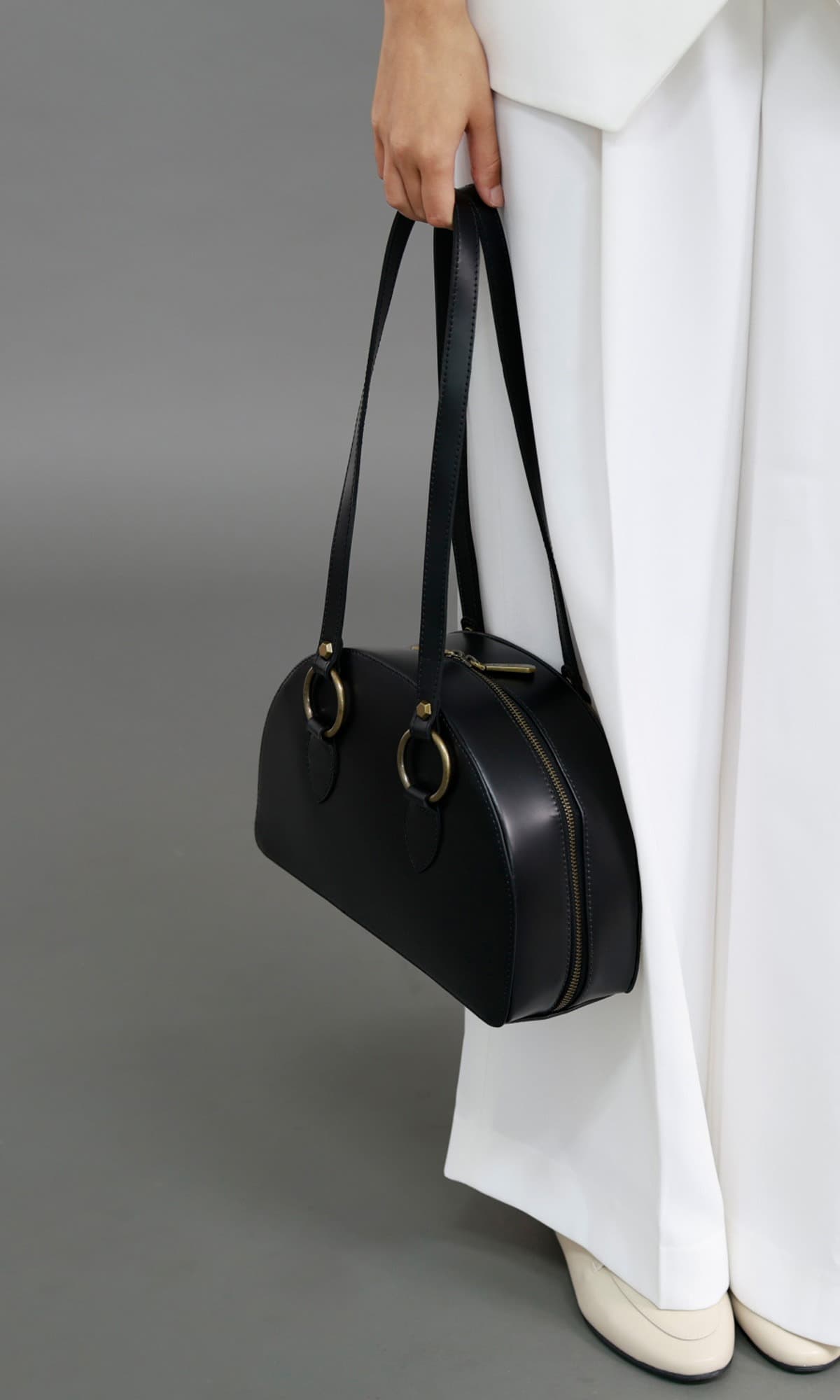 Inspired by vintage bowling bags, Rebecca is a large black leather handbag designed for modern everyday use. With its soft, structured shape, rounded silhouette and long shoulder straps, this retro handbag brings together timeless 1970s style and practical function in one elegant piece.